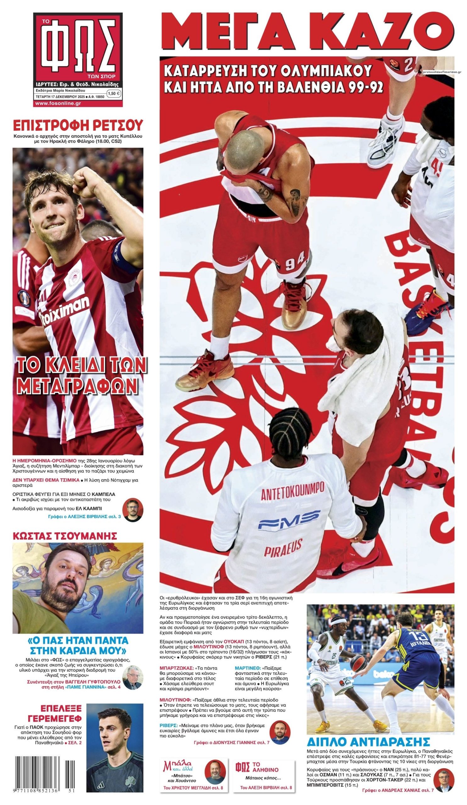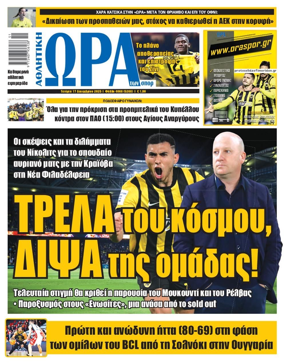 Οι αθλητικές μεταδόσεις της Τετάρτης, 17 Δεκεμβρίου 2025